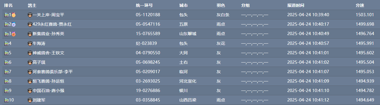 紧接着1分钟内,又连续报进四羽鸽子。来自五原鸽友429永红赛鸽-贾永红的一羽雨点获得第二名,环号05-0547116,分速1499.698米/分。来自山东聊城的外地鸽友新集鸽业-孙秀英的一羽雨点获得第三名,环号15-0765589,分速1496.764米/分。来自包头的鸽友牛海涛的一羽灰花获得第四名,环号纪-023839,分速1495.991米/分。