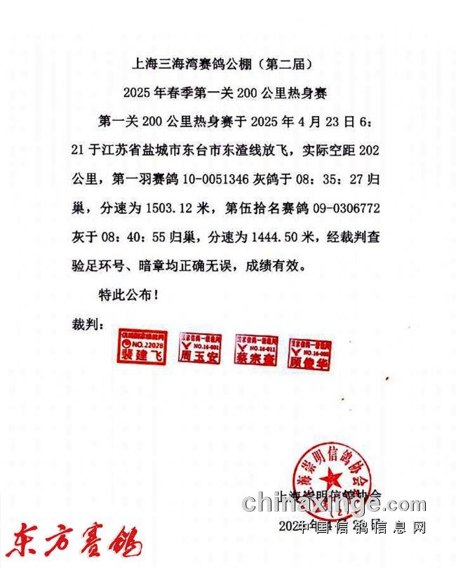 2025年4月23日,上海三海湾春棚第二届春赛首关200公里热身赛于今晨6点21分在江苏省盐城市东台市开笼,8753羽赛鸽参与了本关比赛。