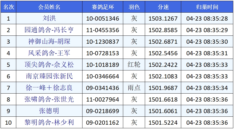 冠军:江苏刘洪麾下悍将10-0051346灰,于08:35:27.77捷足先登摘取桂冠,分速高达1503.1267米/分;