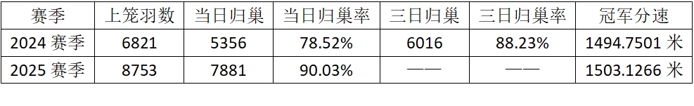 从比对表中可以看出,今年首关当日归巢率已超过去年首关三日归巢率1.78个百分点,冠军分速倒是相差无几,但今年突破了1500米/分大关,也是让人欢欣鼓舞的。