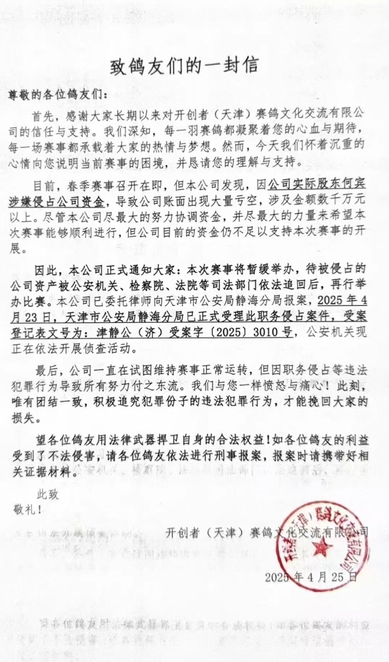4月25日,天津开创者赛鸽文化交流有限公司发布公告,称“因公司实际股东何宾涉嫌侵占公司资金,导致公司账面出现大量亏空,涉及金额数千万元以上。……本次赛事将暂缓举办。”