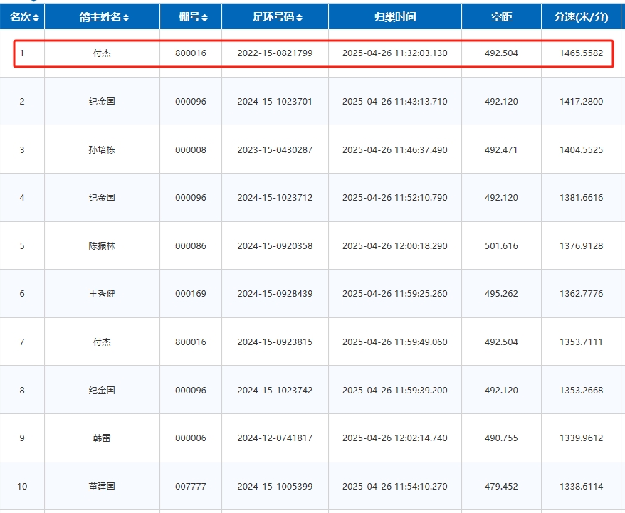 目前,分速最高的是山东滨州博兴龙飞俱乐部归巢的冠军鸽付杰,赛鸽环号2022-15-0821799,归巢时间11:32,飞行空距492.504公里,分速1465.5582米/分。
