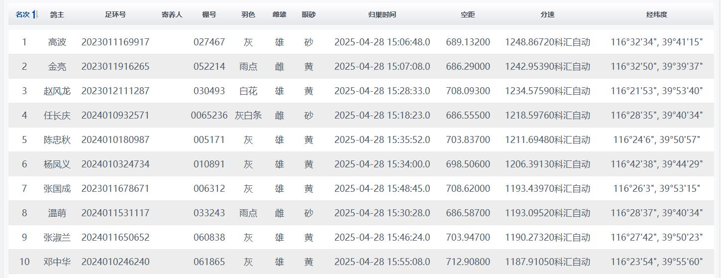 比赛于15点6分48秒见鸽,首羽顺利归来。来自鸽友高波的2023011169917砂眼灰雄以1248.8672米/分的速度夺得冠军,飞行空距为689.13200公里。其名下2024010936618、2023011911147、2024010722254,暂列第13、25、27名。一人连进多羽,果真实力不俗!