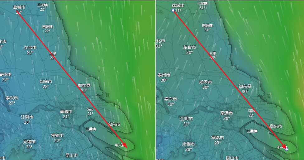气象:司放地射阳县晴天,5点32分开笼时气温16度。途中东台县多云转晴、南通市则阴转多云,归巢地崇明岛阴天。白天赛线最高气温在30度左右,对赛鸽飞行来说是偏高的。选择清晨一早开笼,也是考虑到清晨和早上凉快一些吧。暮春的天气很任性,气温忽高忽低的,温差很大。但30日气温偏高并不是赛鸽飞行的主要矛盾,最大障碍在于全程3——4级的逆风东南风和南风。