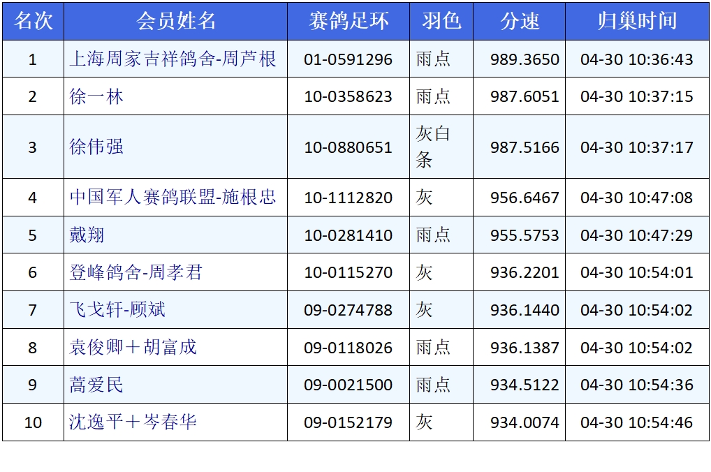 在冠军梯队凯旋后,天空陷入寂静达10分钟,才见第二梯队两羽结伴而来。然后天空又沉静了7分钟,第三梯队5羽迎风归来,排定了本关前十名。本关前十名由江苏和上海鸽友垄断,两省市各取5席雨露均沾平分春色。