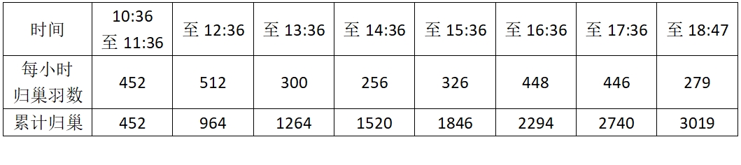 30日的归巢模式以小梯队为主,用时37分报满了本关的100个入赏名额。归巢速度相对缓慢,可见在全程3——4级南风的气象条件下顶风飞行的艰难。但让人欣慰的是,虽然以个位数小梯队的报到模式为主(也有2位数的梯队),但胜在连绵不间断,每小时的归巢进度相对平衡。我们来看看归巢进度表: