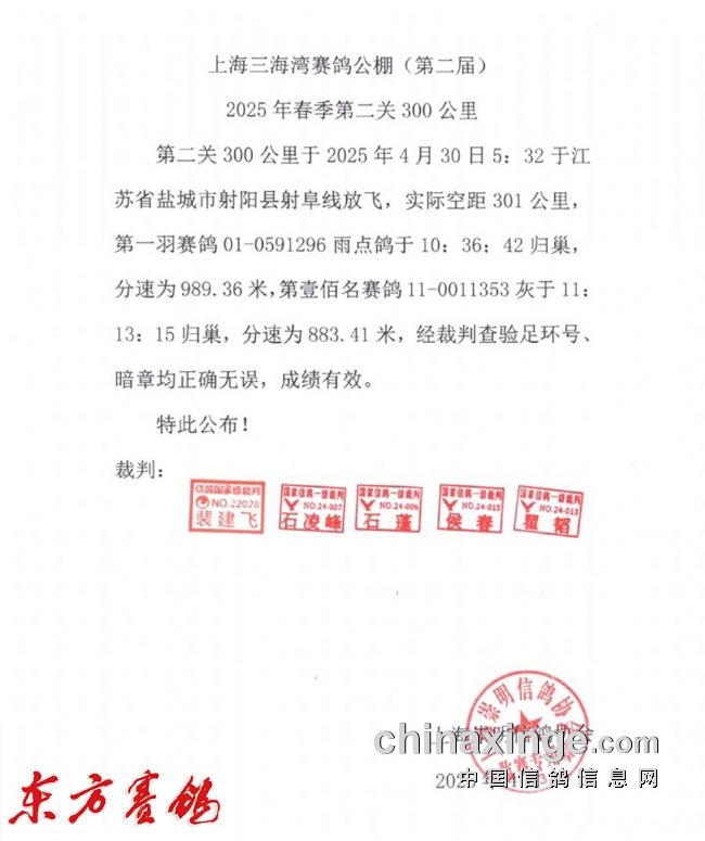 崇明区信鸽协会确认三海湾第二关300公里成绩。