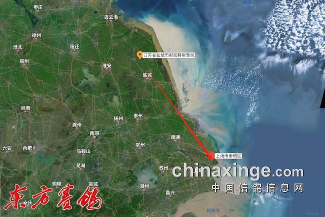 上海三海湾赛鸽公棚第二关300公里赛线图 。