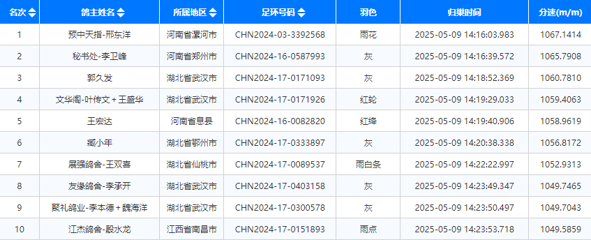 来自湖北武汉本地的鸽友郭久发旗下的一羽灰鸽CHN2024-17-0171093,在两分钟后报到,分速1060.7810米/分,获得季军。这位鸽友另一羽雨点CHN2024-17-0171084也成功进奖,位列29名。本次比赛还有两羽绛鸽进入前十,分别是鸽友文华阁-叶传文+王盛华的一羽红轮,位列第四,鸽友王宏达的一羽红绛,获第五位。