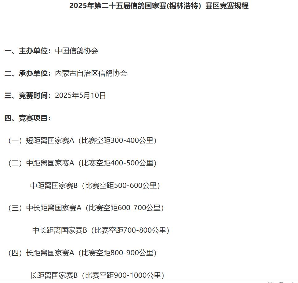 5月10日早5点38分,第二十五届信鸽国家赛内蒙古锡林浩特赛区比赛正式打响。本次比赛汇集多个地区协会,分别来自:山西省、内蒙古自治区、黑龙江省、吉林省、辽宁省、张家口,共计8932羽,1590人(舍)。由内蒙古信鸽协会承办,竞赛项目包括300-1000公里短、中、长距离七个项目。