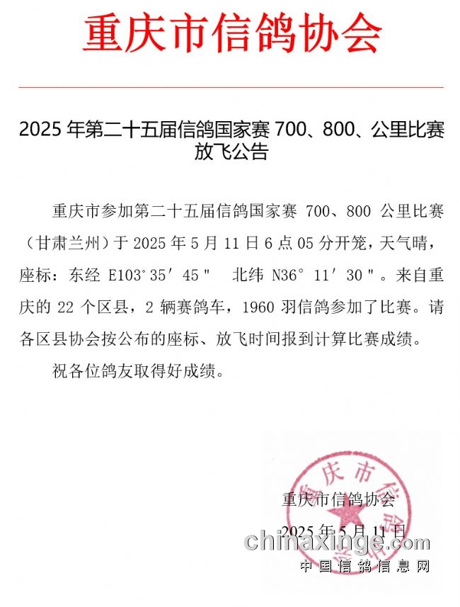 5月11日6点05分,2025年第二十五届信鸽国家赛(春赛)兰州赛区在甘肃省兰州市成功开笼放飞,来自重庆市22个区县共1960羽信鸽参与本次赛事。开笼当天天气晴,司放地坐标东经E103°35′45″北纬N36°11′30″。