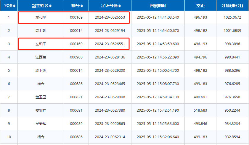 令人惊叹的是,12分钟后,其同舍的2024-23-0626551赛鸽也打钟归来,再夺季军,分速998.3896米/分,成就"一门双杰"佳话。