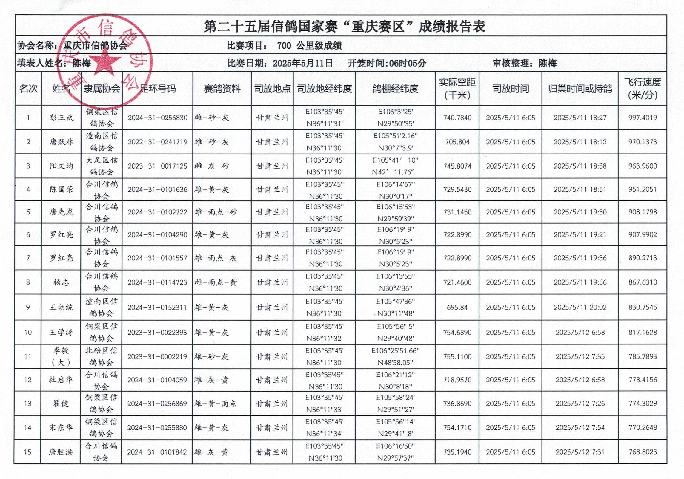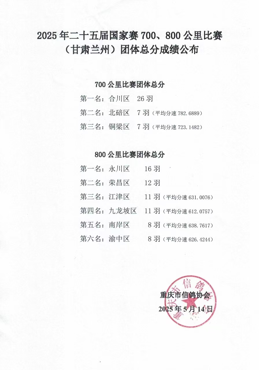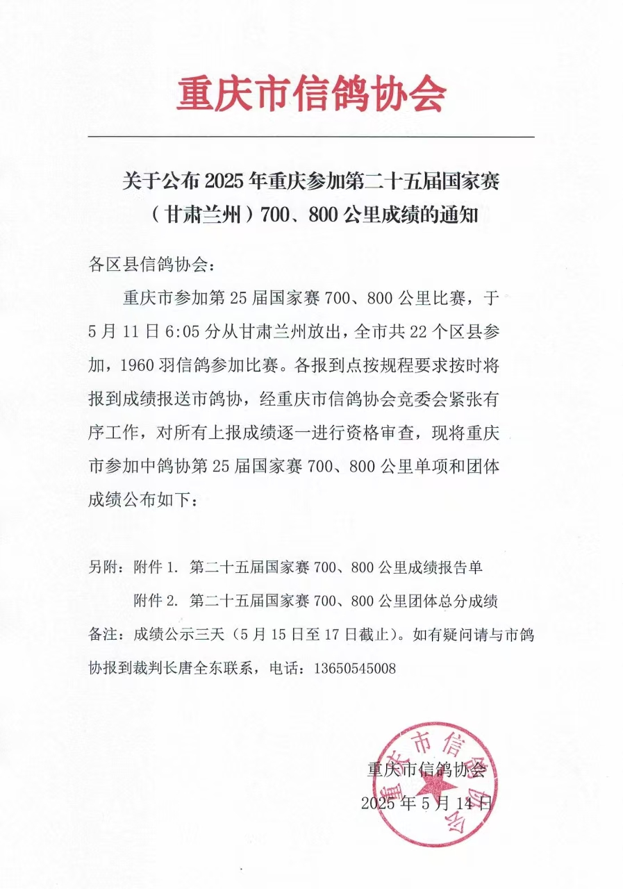 成绩揭晓:重庆市信鸽协会已公布第25届信鸽国家赛700、800公里成绩,如下:点击图片查看清晰大图