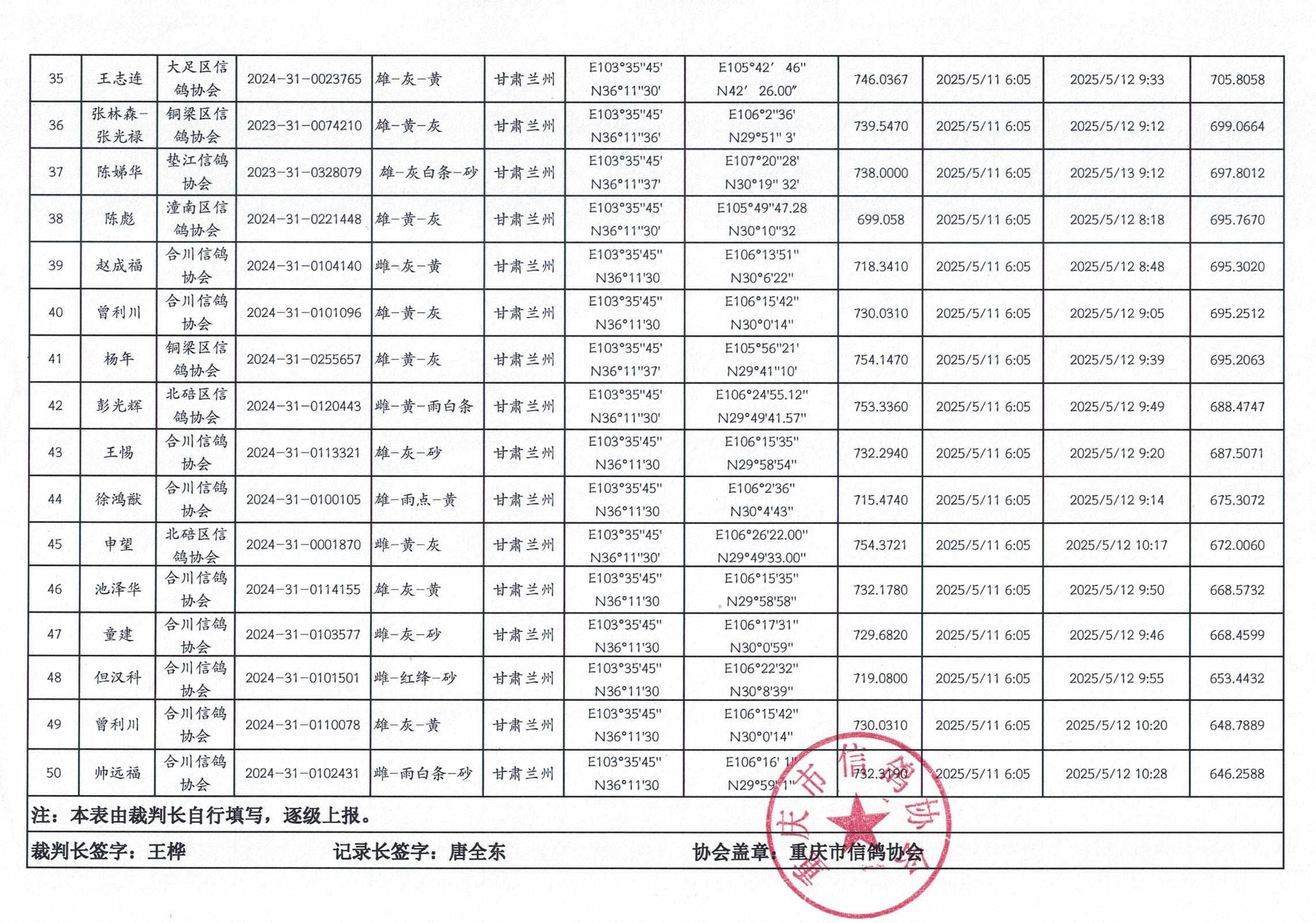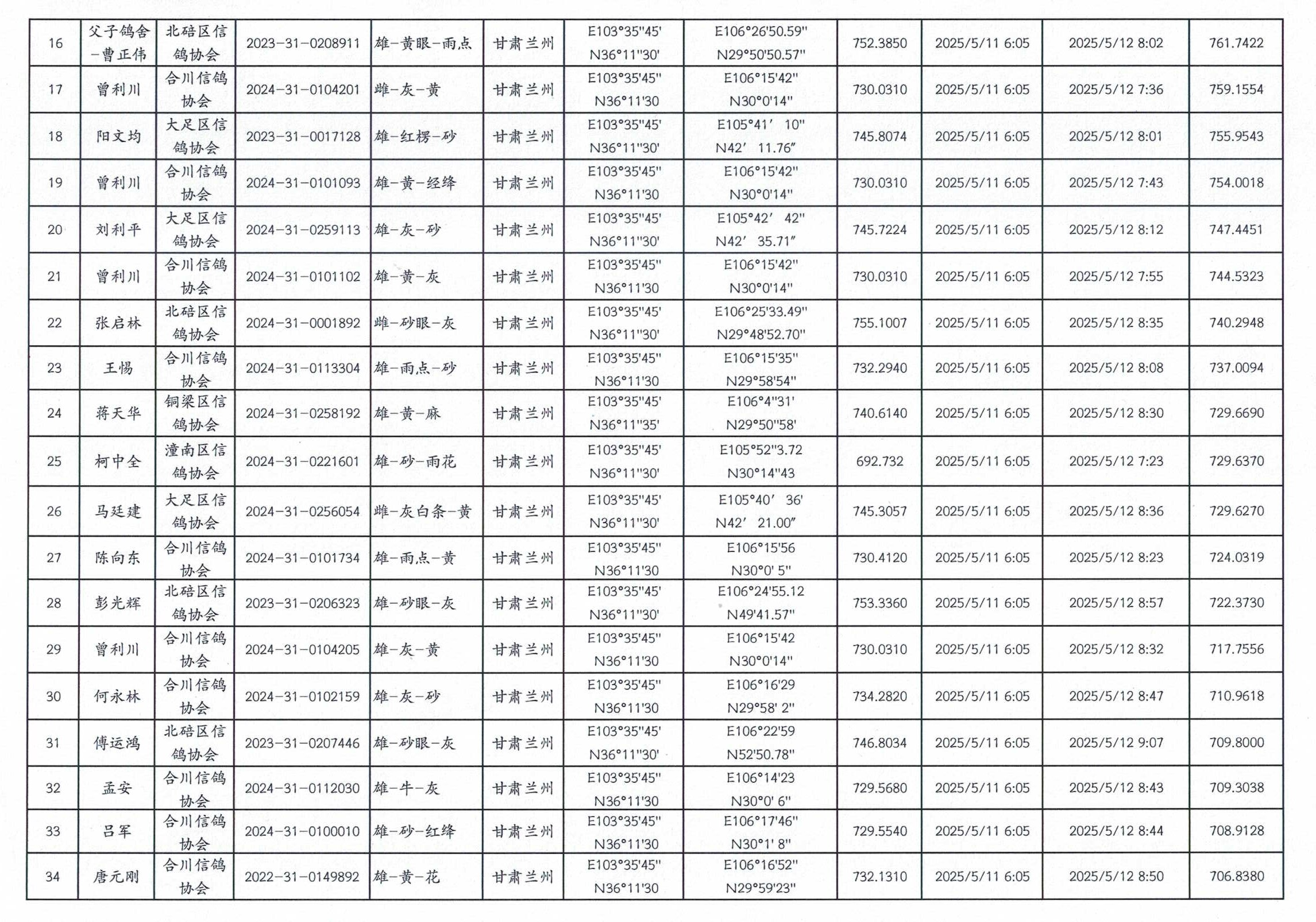 第二十五届信鸽国家赛兰州赛区成绩公示