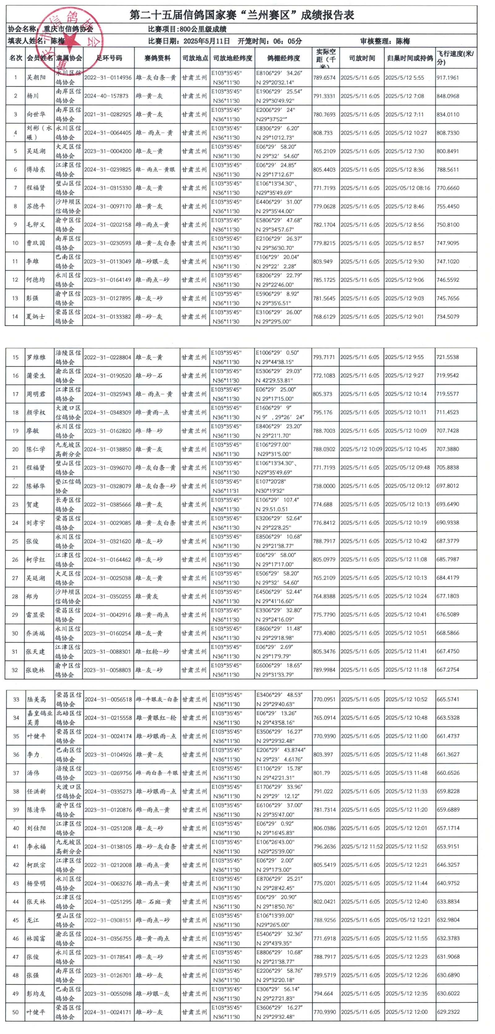 第二十五届信鸽国家赛兰州赛区700、800公里成绩公示