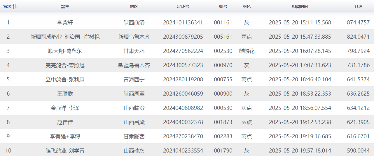 四川公棚归巢不佳,陕西公棚的归巢情况同样艰难。5月20日5时18分,陕西宝鸡鸿晟赛鸽公棚加站赛在山西省介休市开笼放飞,集鸽1080羽,空距519公里。开笼当天只归巢10羽赛鸽。鸽友李紫轩的一羽2024101136341灰鸽于15时11分率先归巢,分速874.4757米/分。截至21日上午10点30,归巢42羽,归巢率3.89%。数据直播>>