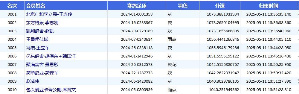 经过近六个小时的激烈角逐,首羽归巢鸽于当天中午13点36分35秒成功报进。然而,最终在有效时间内归巢仅474羽,不足三成的归巢率,依旧难逃“春赛难飞”的魔咒。