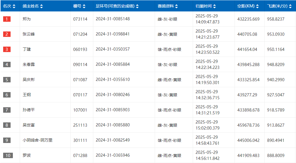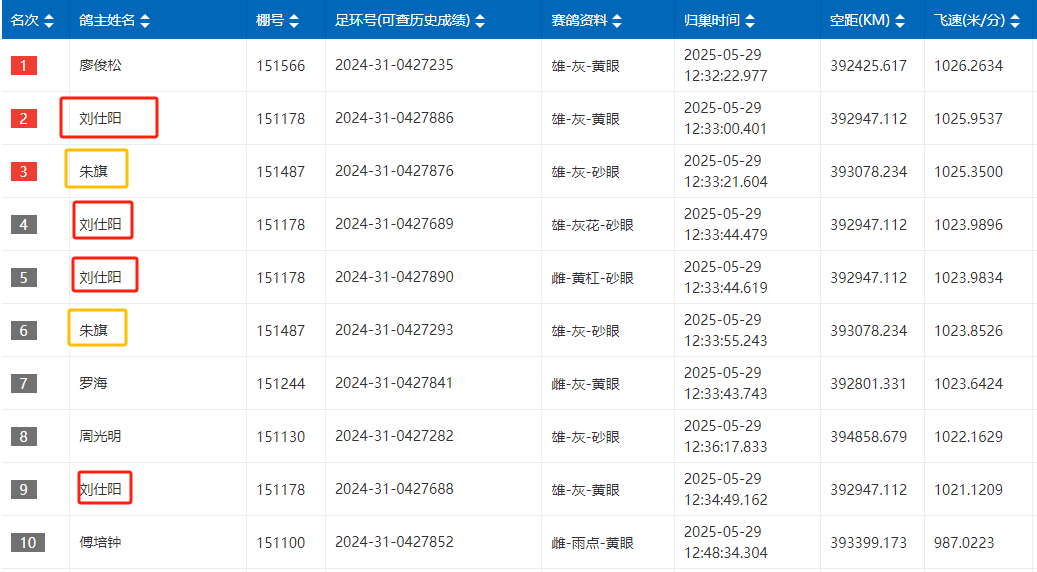 拿下季军的是鸽友朱旗,他的一羽砂眼灰色雄鸽2024-31-0427876,分速1025.3500米/分,实际空距393公里。朱旗鸽友麾下另一羽赛鸽也挺近前十榜单,位列第六。