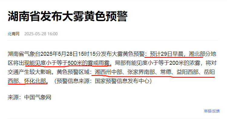 5月28日15时15分,湖南省气象台发布大雾黄色预警,预计29日早晨,湘北部分地区将出现能见度小于等于500米的雾或雨雾,局部有能见度小于等于200米的浓雾。黄色预警区域:湘西州中部、张家界南部、常德、益阳西部、岳阳西部、怀化北部。