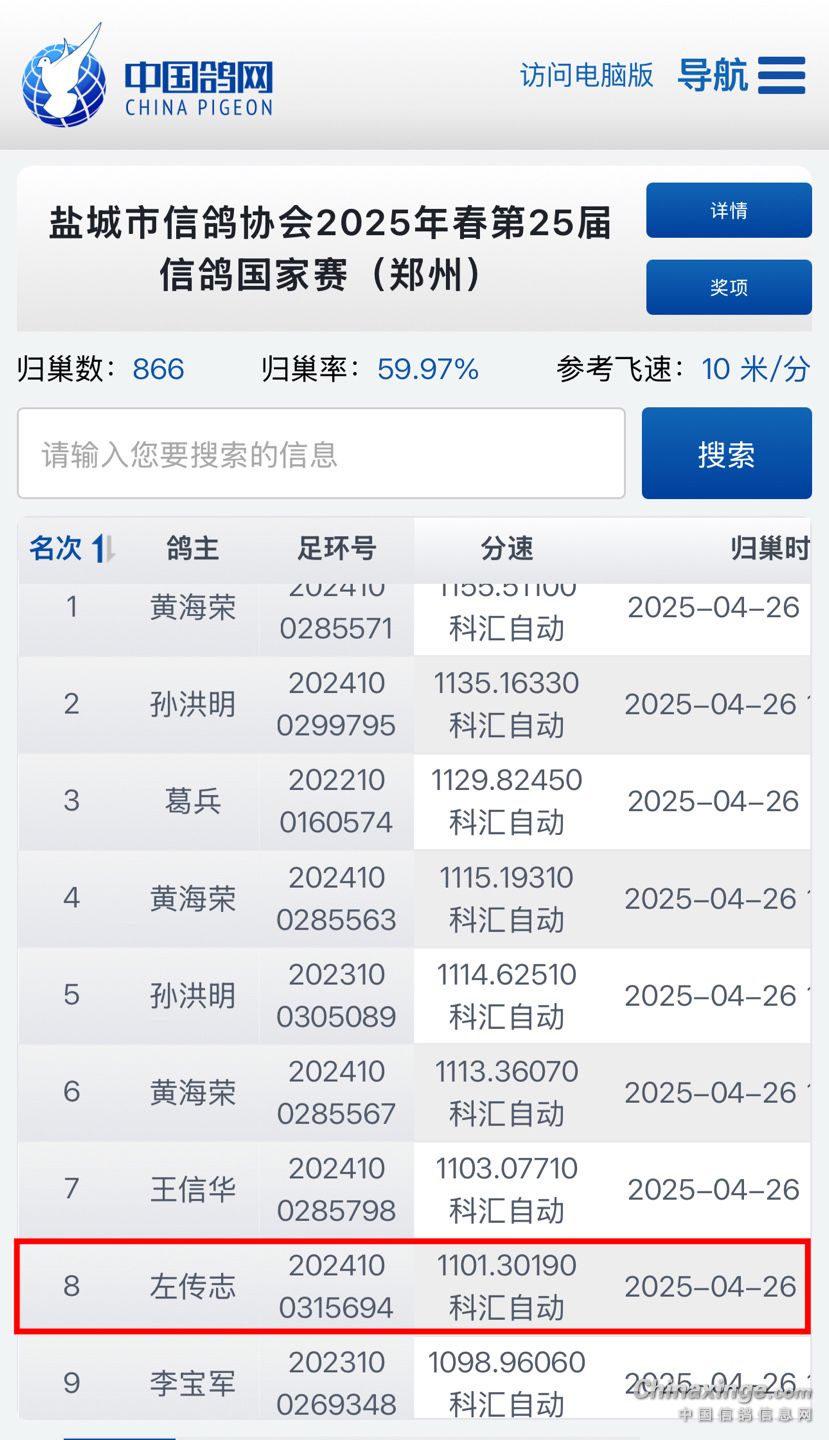 2025年春第25届国家赛(盐城赛区),在4月26日早晨5点56分,位于河南省郑州市放飞,共计集鸽1444羽。左传志又荣获盐城市【第八名】的好成绩!