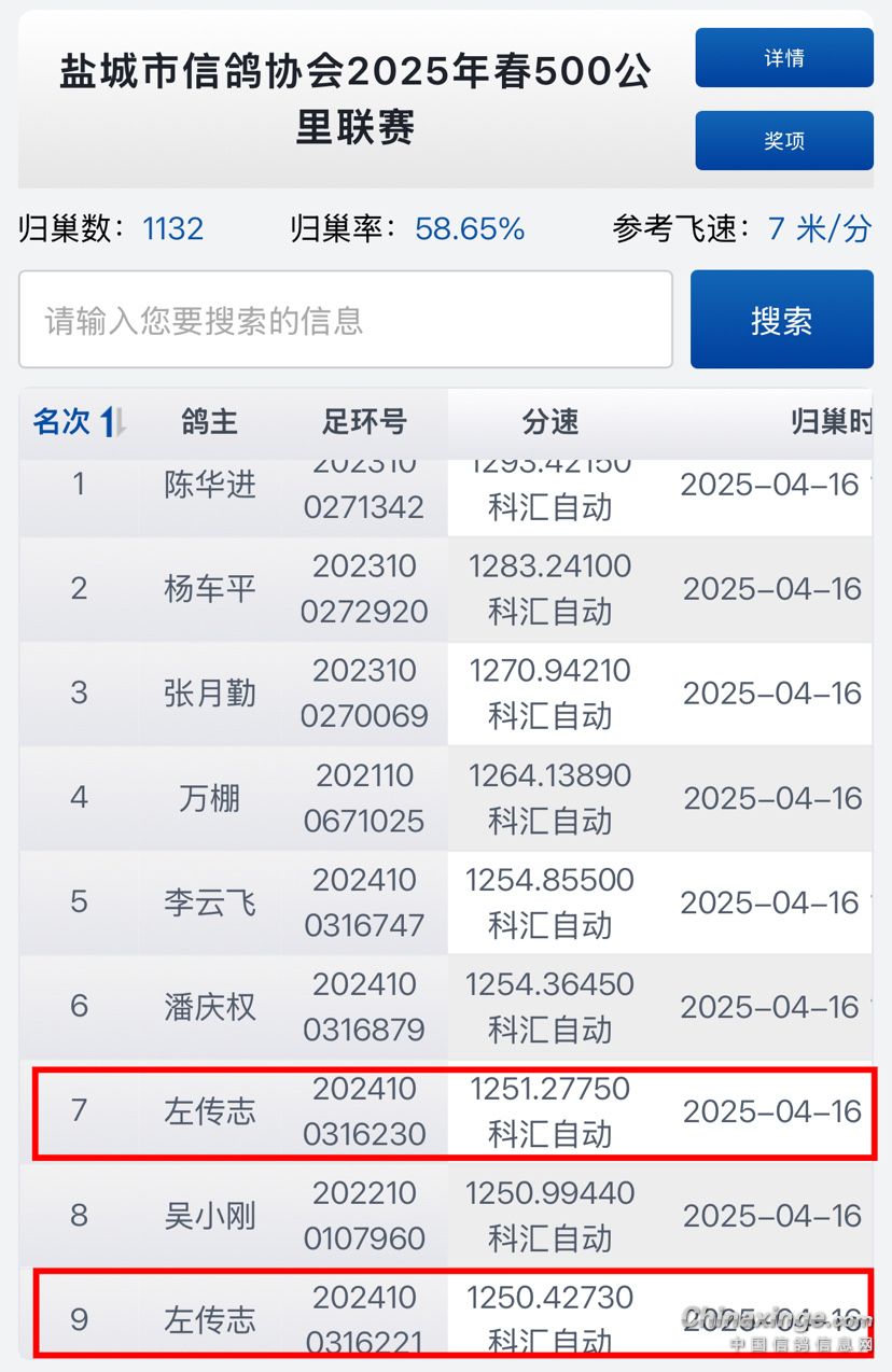 2025年春盐城市500公里联赛,在4月16日早晨6点08分,位于河南省民权服务区放飞,共计集鸽1930羽。左传志获得盐城市【第七名】和【第九名】的好成绩,同时也是盐城全市唯一一人前十名进2羽!
