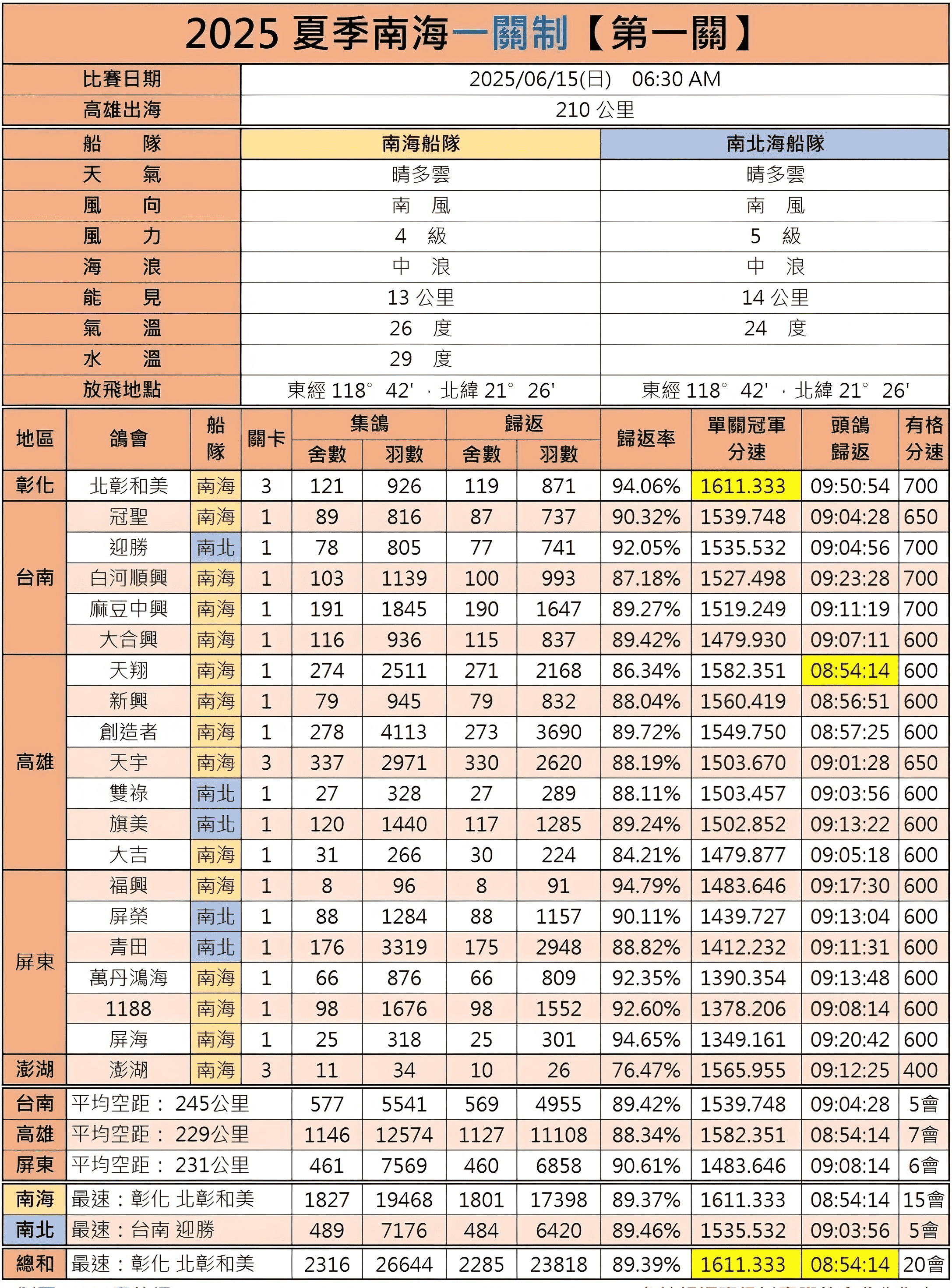 “好风凭借力,送我夺冠军”,借助南风的顺风优势,本次彰化地区北彰和美鸽会一羽小将于9时50分归巢打钟,飞出1611.333米/分的最高分速,拿下本次比赛冠军,展现出卓越的定向能力与体能储备。