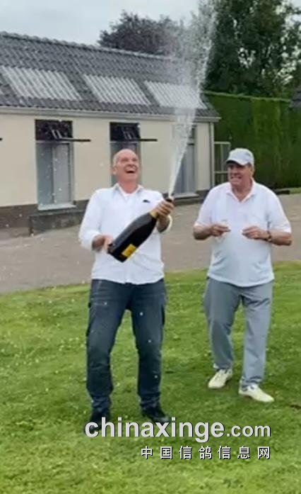 这羽赛鸽名叫“汤妮”,血系颇有来头,父亲是“能量小子之父”ד达恩之母”作出,母亲是柯尔·海德“米歇尔直孙”×巴腾伯格“年轻白腹号直子”ד哈利全妹”作出。从照片中可以看到,鸽主正在开香槟庆祝自己夺冠,喜悦之情溢于言表。