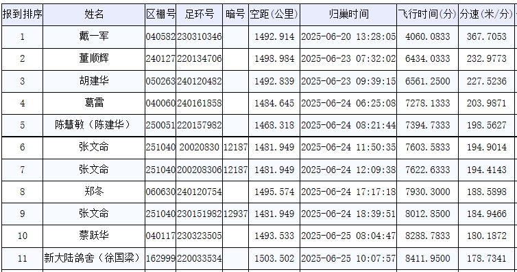 前十名赛鸽成绩