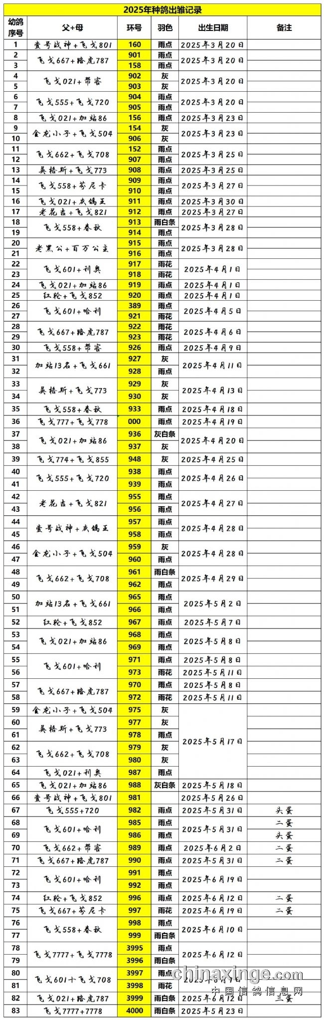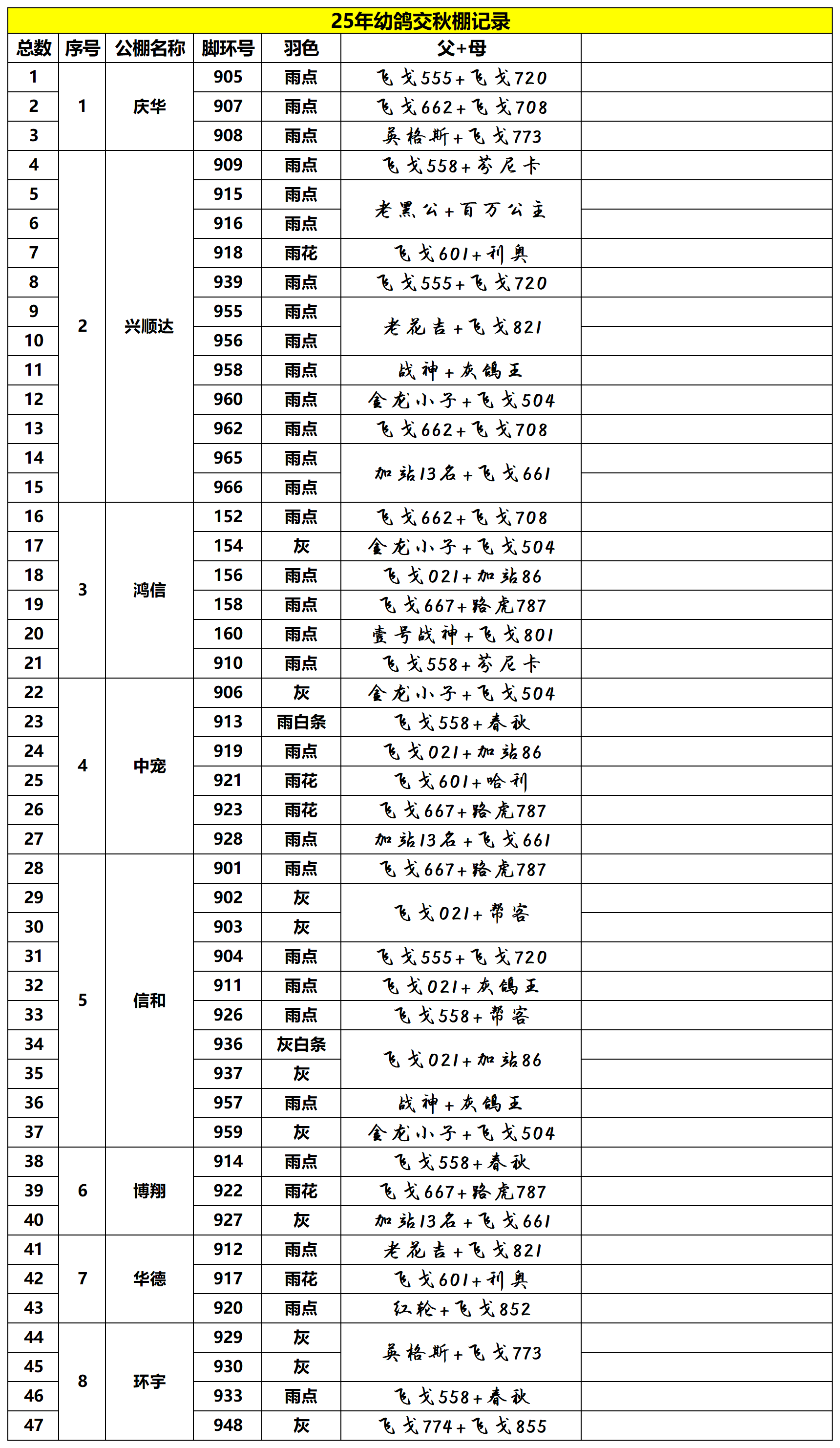 2025年种鸽育赛、制种工作结束了,一共大约出了90羽幼鸽,自然和人为的淘汰了几只,一共剩下83羽幼鸽,包括近亲回血留种幼鸽。