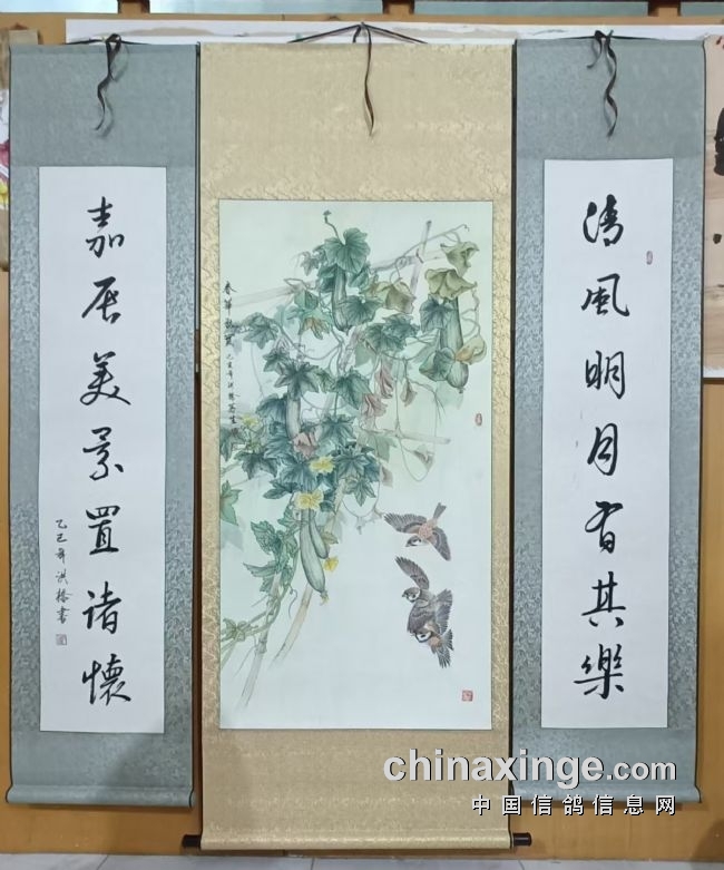 (画家鸽友兄弟给我画的中堂,《春华秋实》,对联是:春风明月有其乐,家晨美景置诸怀)