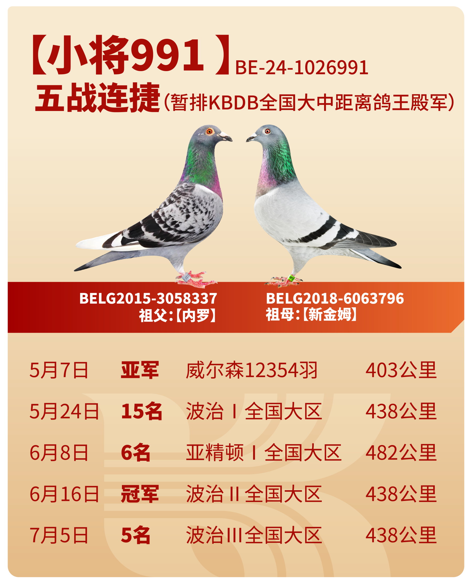 顶尖血脉铸就非凡实力,赛场亮剑尽显王者风范。小将991能否代表中国赛鸽力量,更进一步,闪耀KBDB鸽王榜?我们屏息以待!