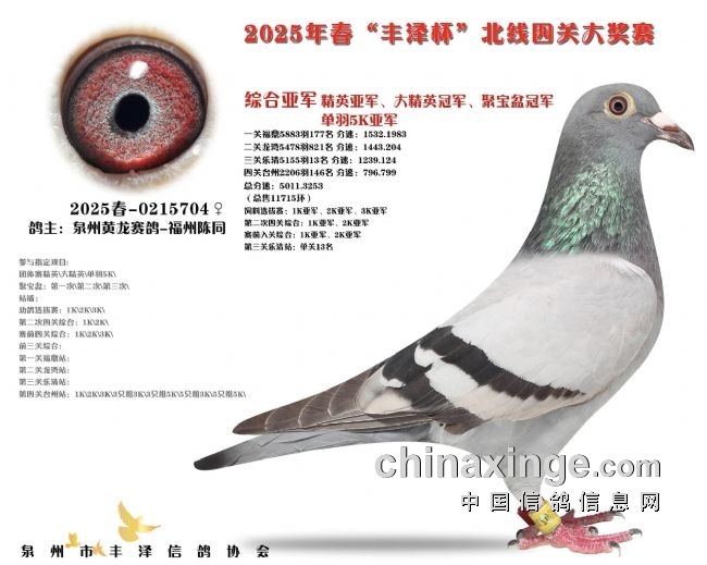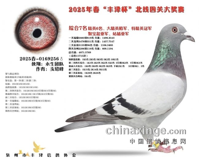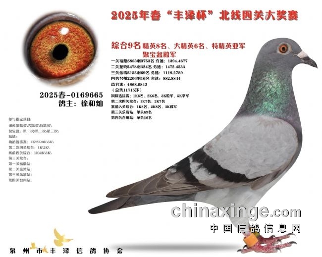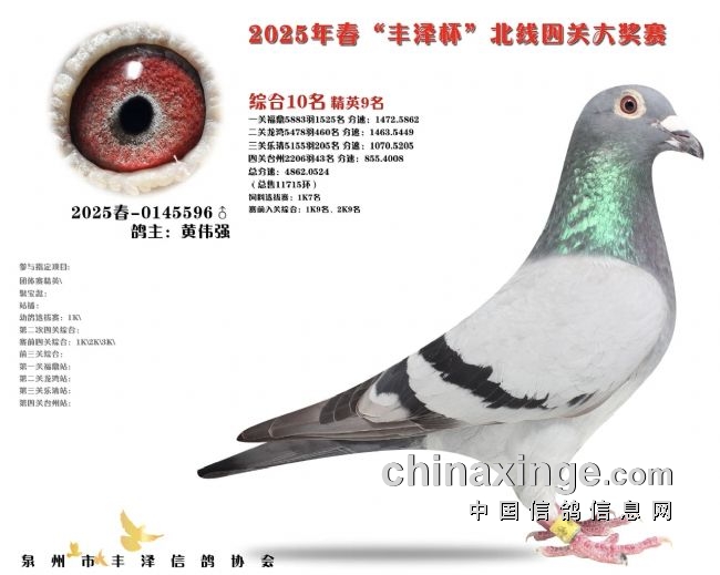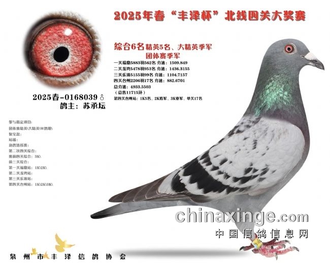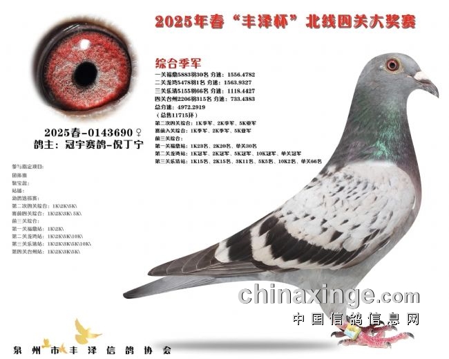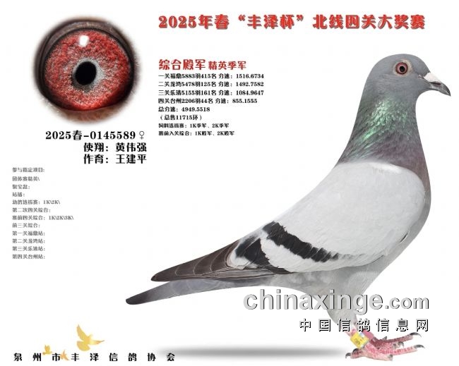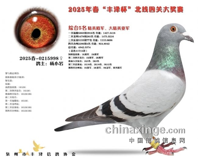 四关综合冠军鸽主为骆灿阳,其名下环号“2025春-0145335”的雨点雌鸽,以第一关108名、第二关84名、第三关15名、第四关195的成绩,荣获2025年春季泉州丰泽杯四关鸽王赛总冠军。下面一起来欣赏鸽王前十风采!