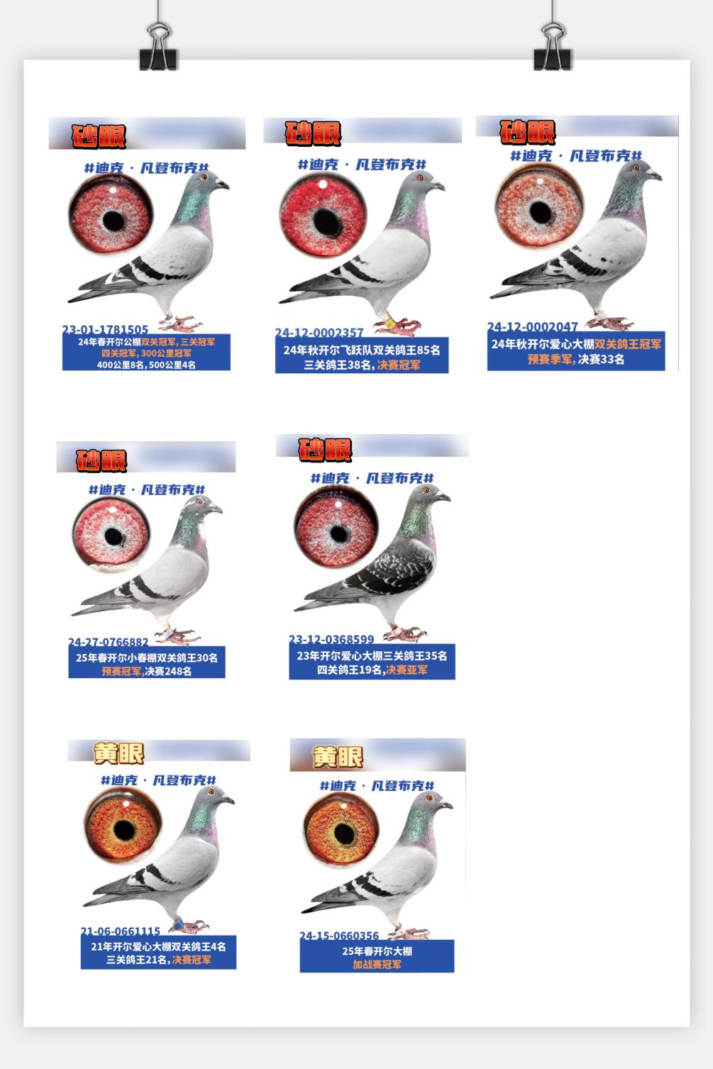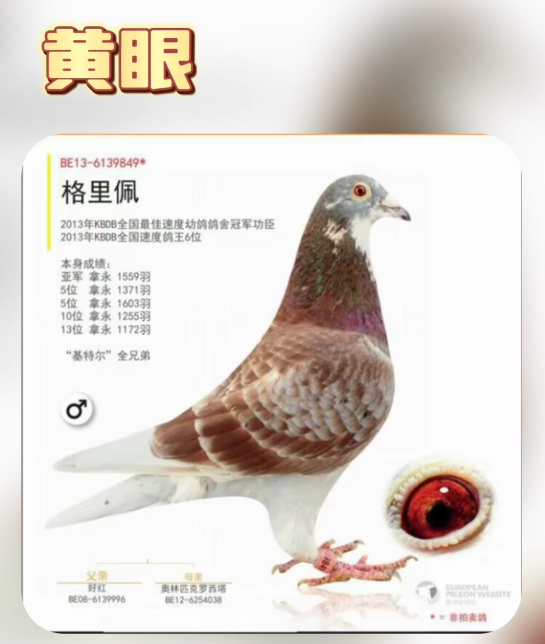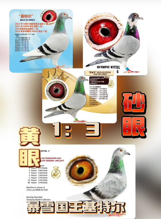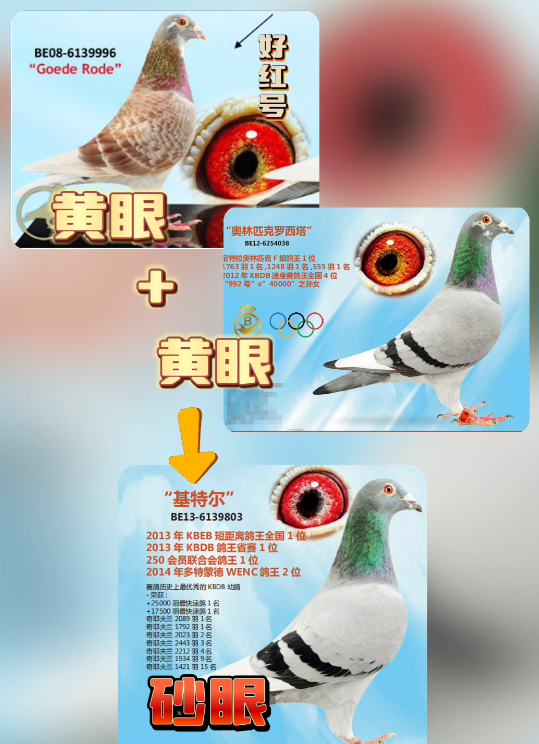 而作为源头的基特尔自身是砂眼,父亲好红号6139996是黄眼,母亲奥林匹克罗西塔也是黄眼,两只黄眼出砂眼基特尔,而亲兄妹格里佩是黄眼,一个鸽王冠军,一个鸽王6名。如果咱们下定义说黄眼不好,基特尔的父母就是黄眼,如果育种是黄眼好,但几只代表鸽都是砂眼,遗传也都不错。所以最终凡登布克血系究竟是黄眼好还是砂眼好,交给大家评论吧。