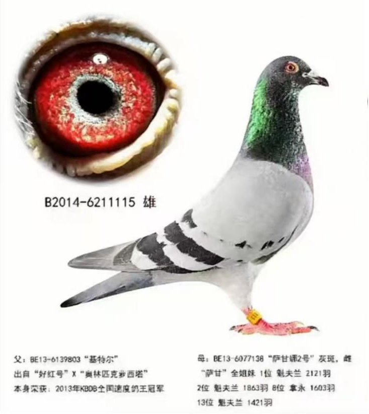 先说他的父亲115,他是基特尔与萨甘鸽王亲妹妹138直接作育,基特尔自身是速度鸽王冠军,萨甘KBDB短距离鸽王全国冠军,所以115也算是双速度鸽王冠军的直接子代。从血缘上讲基特尔是996与996亲兄弟992孙代的祖孙结合,1代与3代的回血融合之作。
