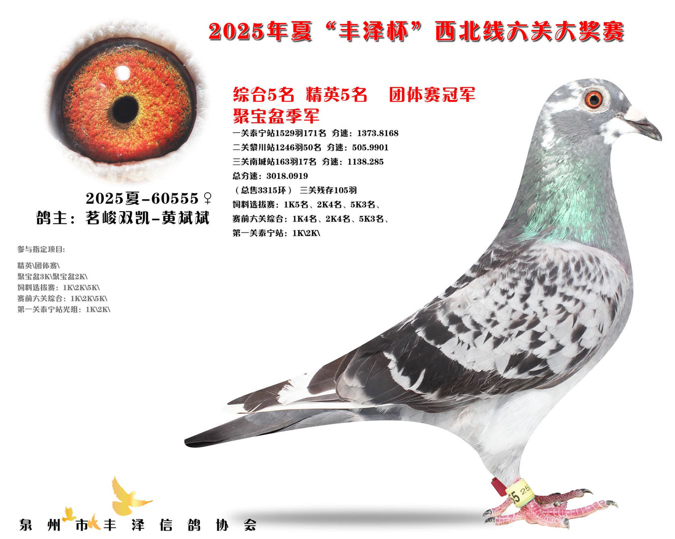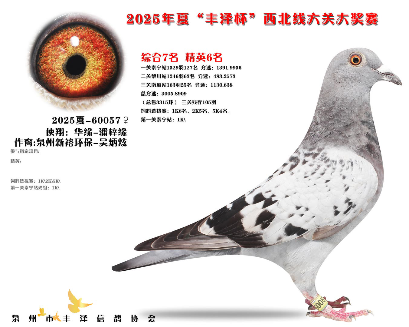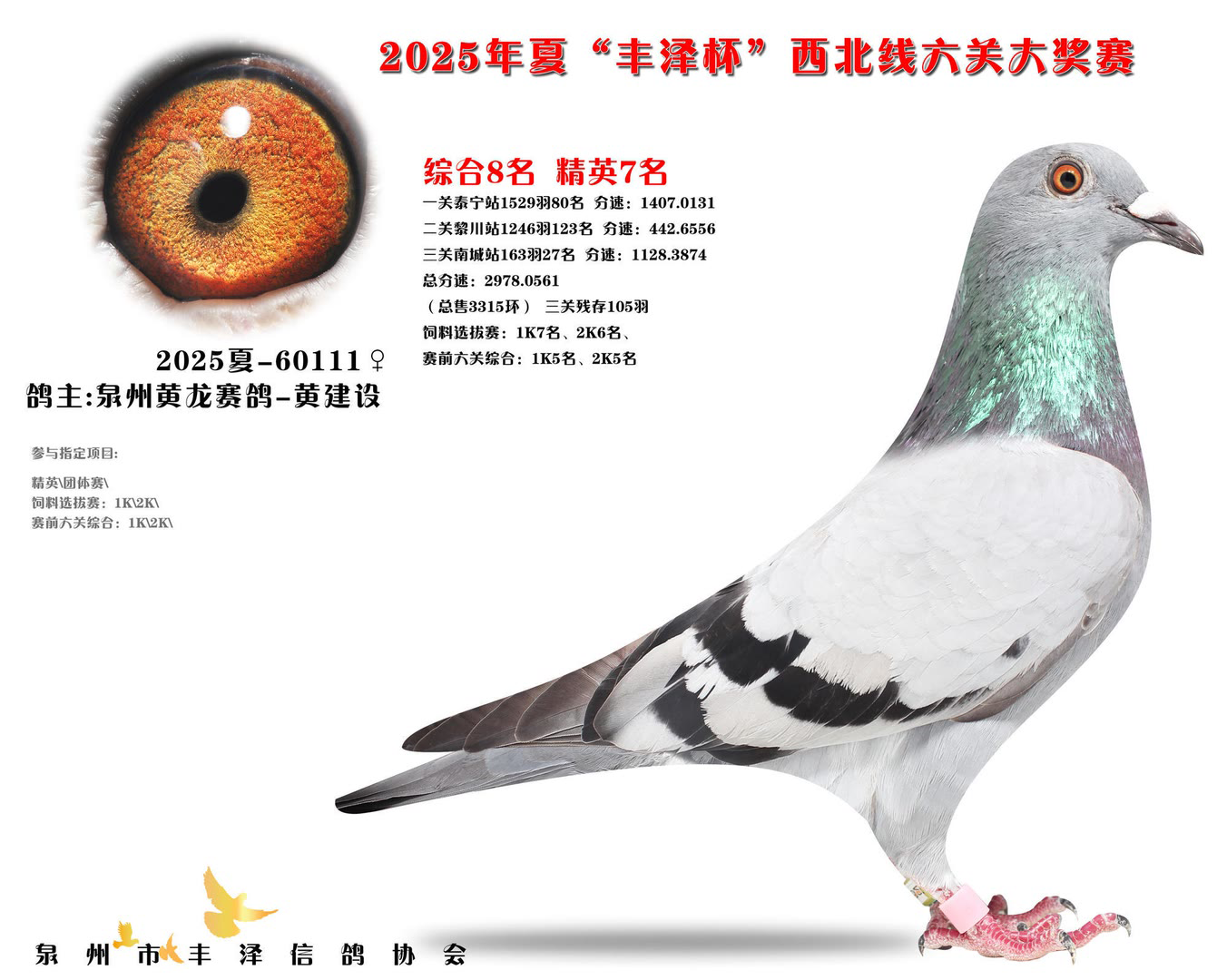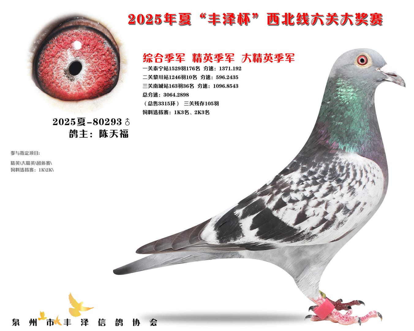 2025年泉州市丰泽区信鸽协会——夏季西北线六关大奖赛中,共售出3315枚参赛环。经过激烈的角逐,最终有105羽赛鸽成功通过前三关的考验,完成了本次比赛的征程。由于后续比赛羽数不足,不得不提早结束比赛。 其中,一羽彩衣大将横空出世,气势如虹!它来自茗峻双凯-黄斌斌鸽友名下,以首关斩获22名,二关跃居第9,三关更以惊艳表现勇夺季军,凭借全程稳定且高位不断的稳定发挥,强势问鼎鸽王冠军,成为本届赛事的最大亮点。下面一起来欣赏鸽王前十风采: