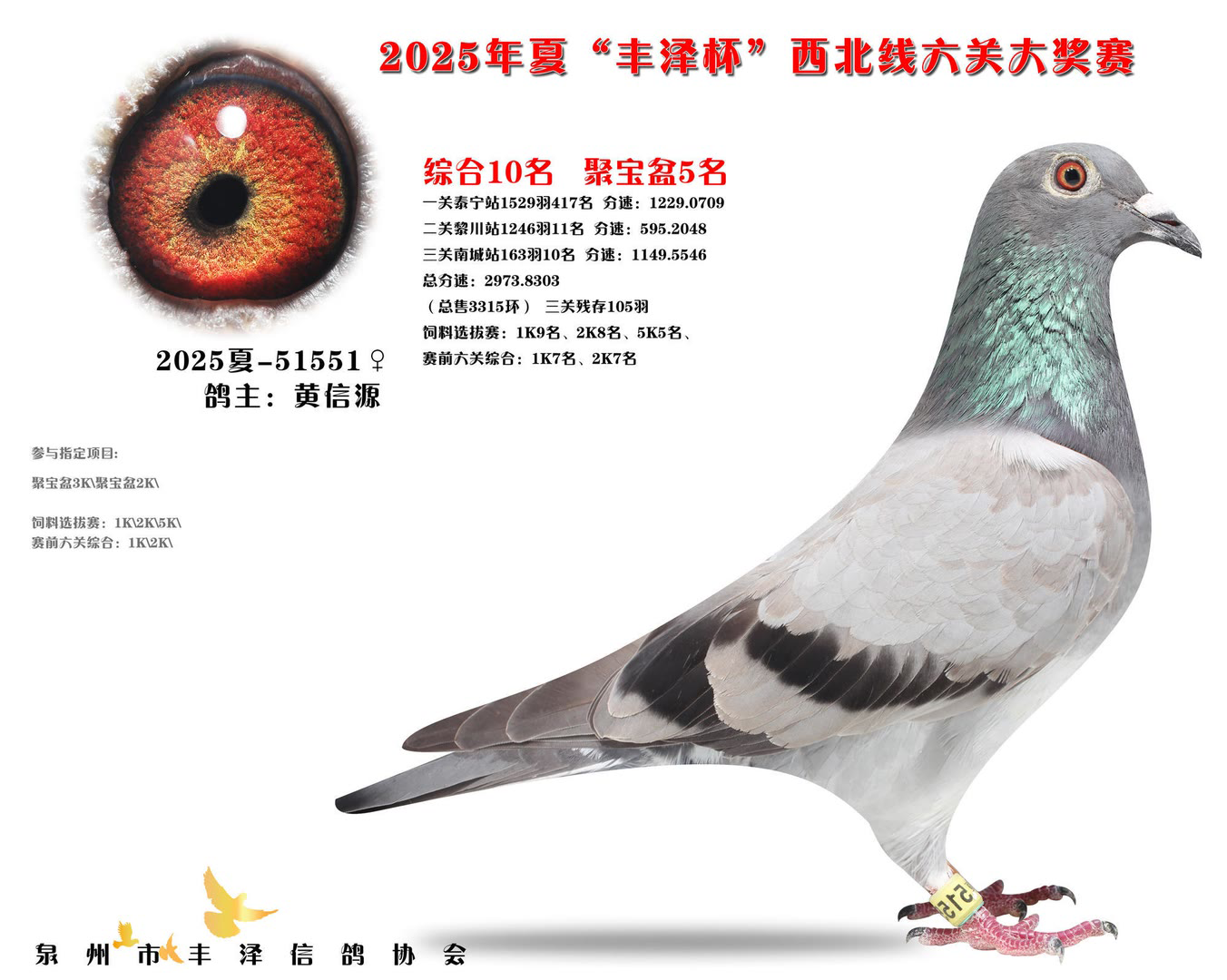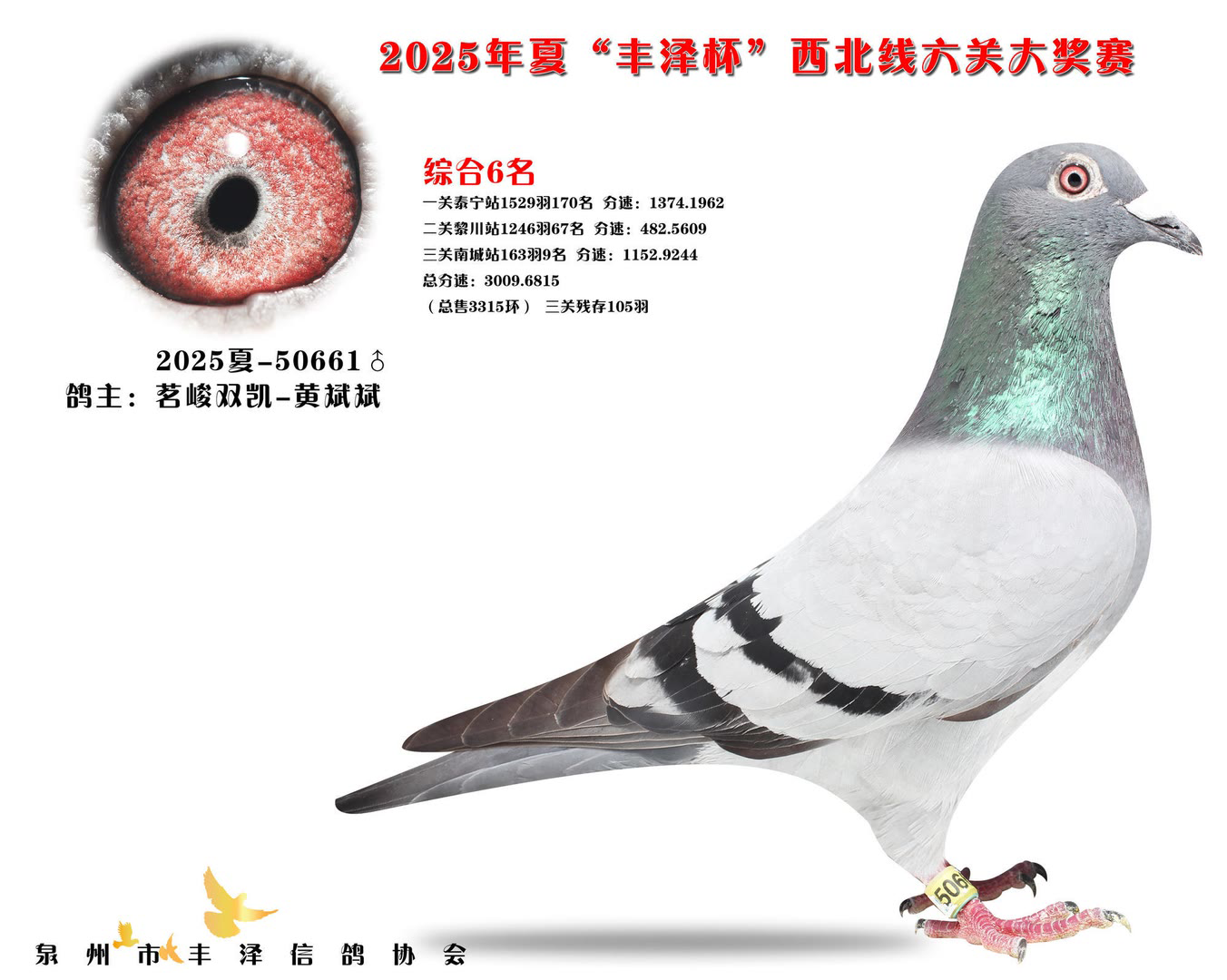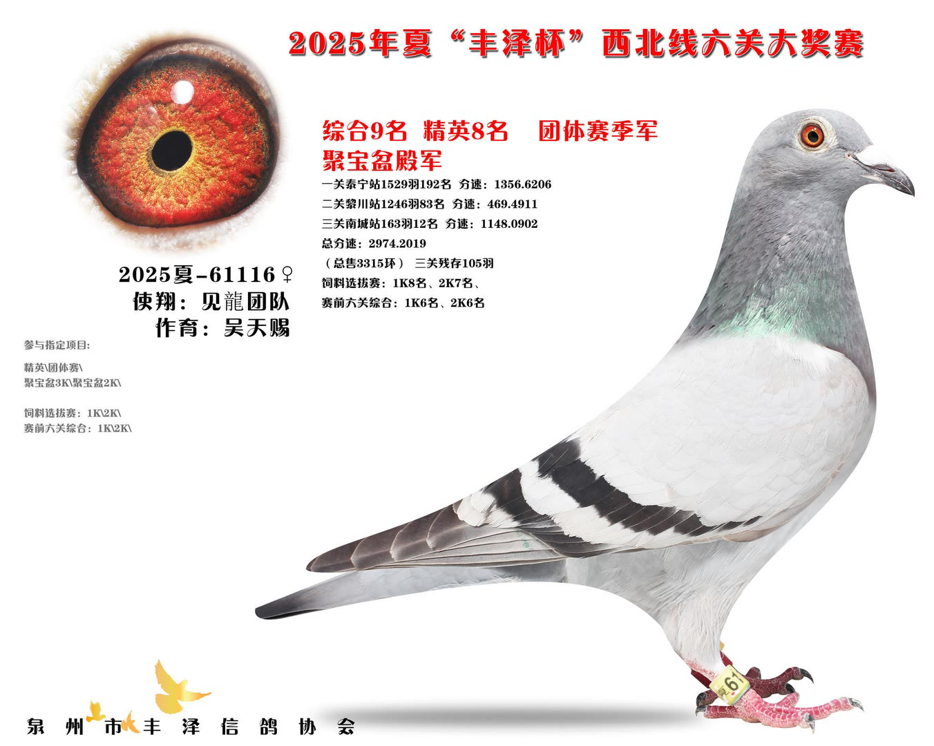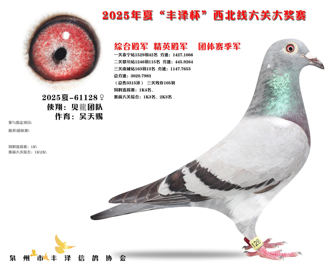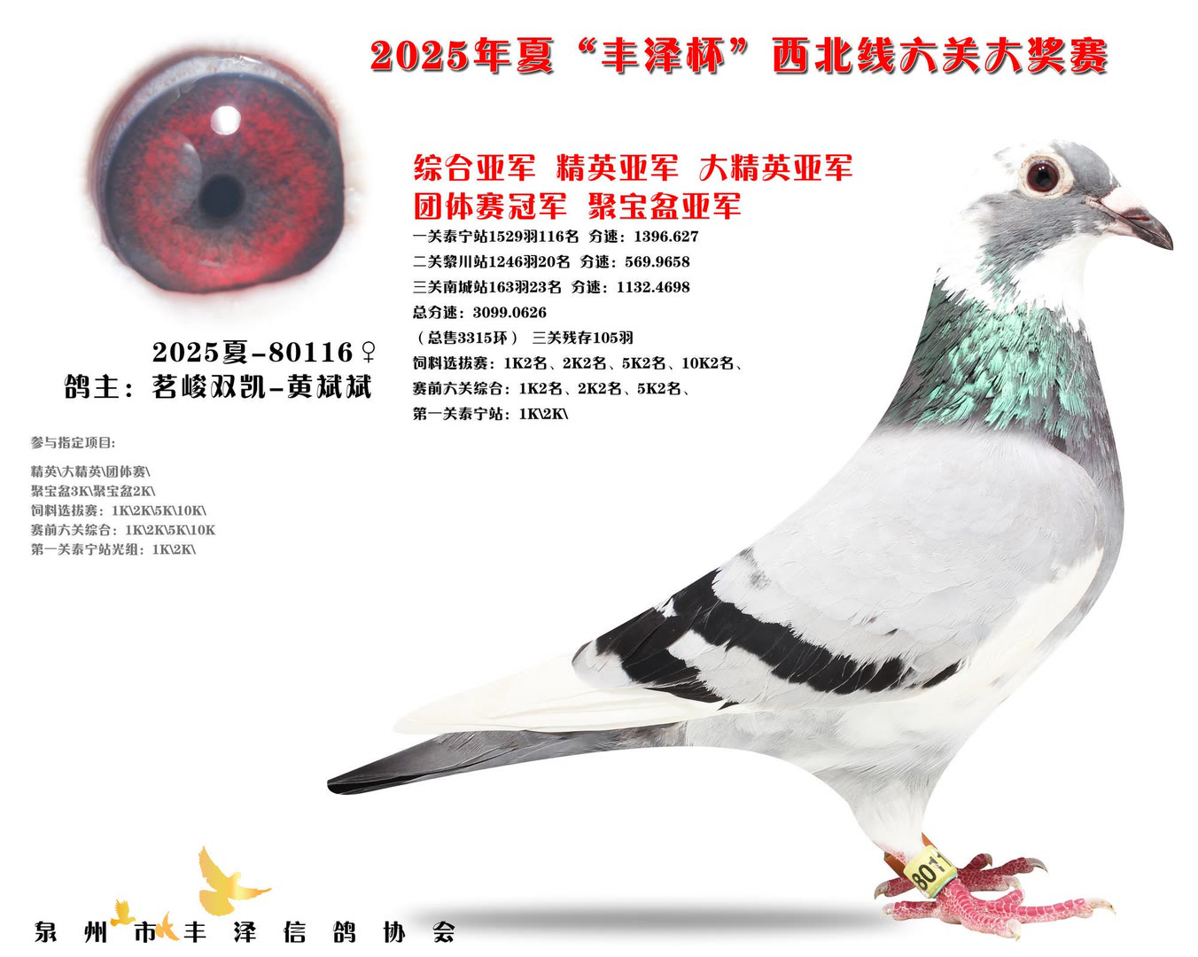 2025年泉州市丰泽区信鸽协会——夏季西北线六关大奖赛中,共售出3315枚参赛环。经过激烈的角逐,最终有105羽赛鸽成功通过前三关的考验,完成了本次比赛的征程。由于后续比赛羽数不足,不得不提早结束比赛。 其中,一羽彩衣大将横空出世,气势如虹!它来自茗峻双凯-黄斌斌鸽友名下,以首关斩获22名,二关跃居第9,三关更以惊艳表现勇夺季军,凭借全程稳定且高位不断的稳定发挥,强势问鼎鸽王冠军,成为本届赛事的最大亮点。下面一起来欣赏鸽王前十风采: