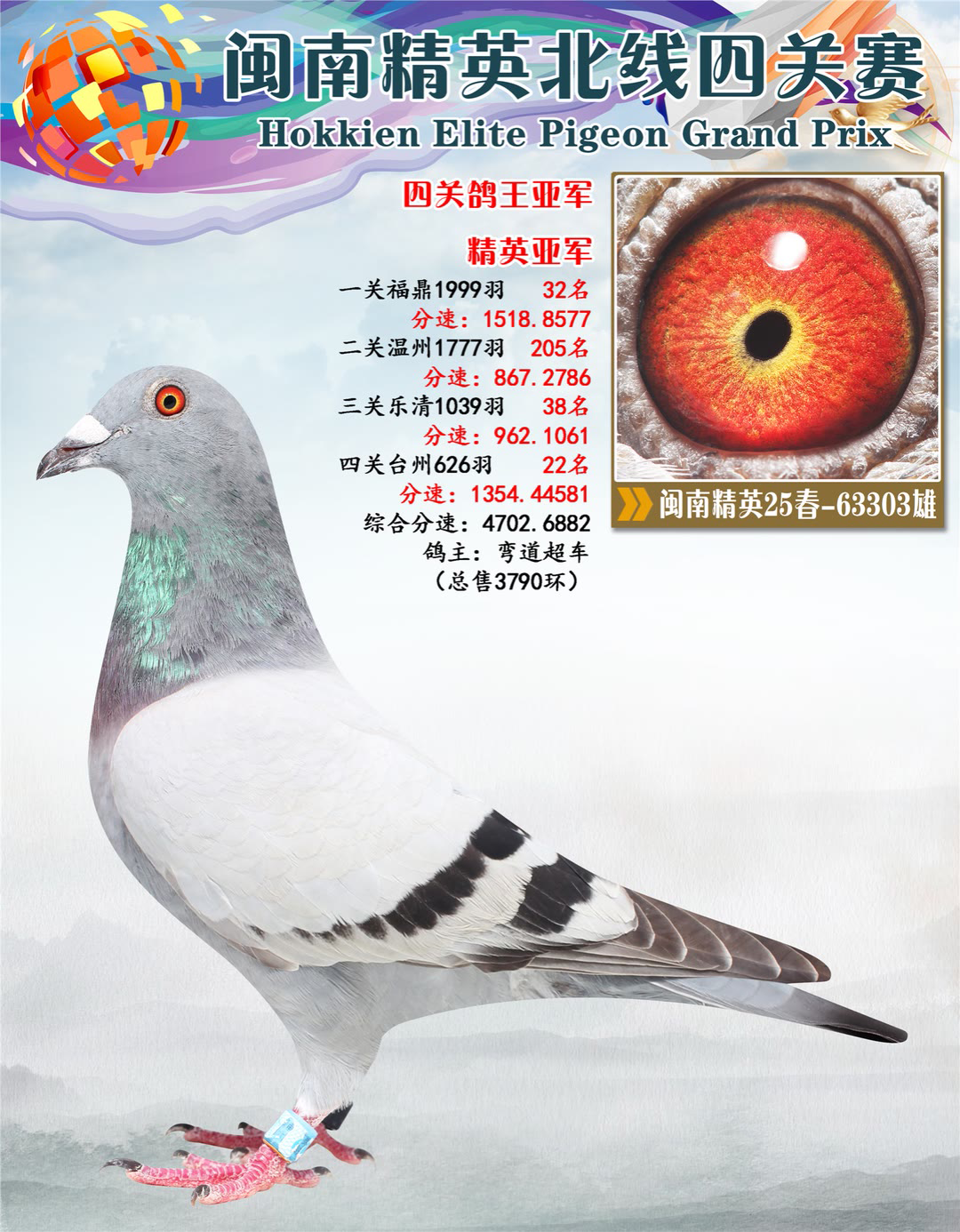 四关鸽王冠军(苏承坛):以首关64名稳健开局,二关212名蓄力蛰伏,三关强势跃升至13名,四关再夺亚军,凭借全赛程稳定发挥,力压群雄,登顶鸽王宝座;