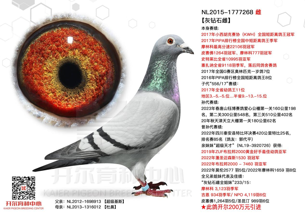 父亲超级基斯,以4项冠军获WHZB全国最佳雄鸽4位。金色图勒的同父兄妹灰钻石雌,曾以5战3冠1亚1季的统治级表现,夺得17年荷兰KWH全国短距离鸽王冠军,开尔200w收藏。