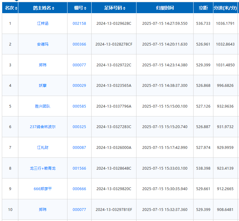 江梓涵的2024-13-0329628C,飞行空距536.733公里,分速1036.1791米/分,获冠军;