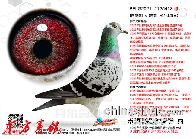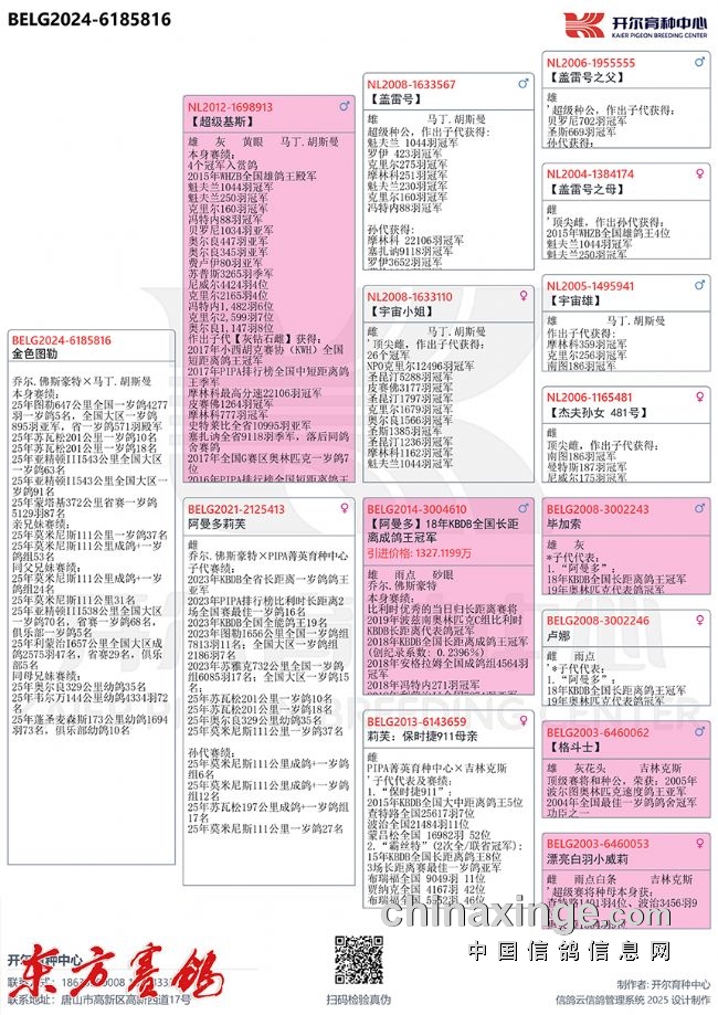 BELG2024-6185716,荣获全国一岁鸽32名,全国大区8名,省赛11名。父亲:BELG2022-6208832超级配对直子×阿米卡。母亲:BELG2023-2028307阿曼多x仟翼