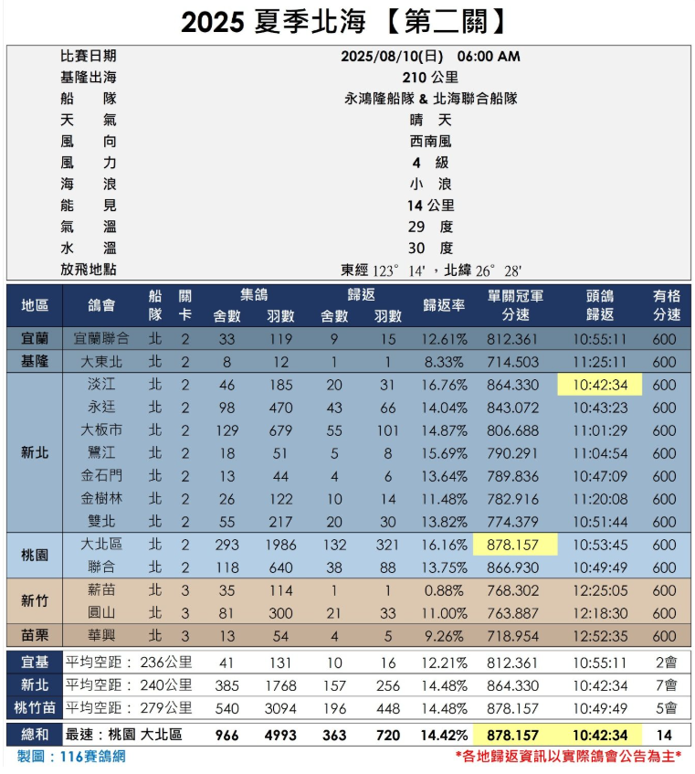 2025年8月10日,台湾夏季北海赛事迎来了第二关的激烈角逐。本关比赛汇聚了4993羽赛鸽,吸引了来自14家鸽会和966个鸽舍参与。清晨6点整,在永鸿隆船队与北海联合船队的护送下,参赛鸽们在基隆港外海210公里处被放飞。当日天气晴朗,西南风4级,海上小浪轻拂,能见度达到14公里,水温维持在30℃,而气温则为29℃。