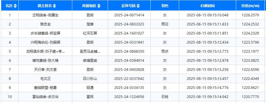 9点15分,第一批归巢小队顺利归来。来自云翔鸽舍-倪康生鸽友的2025-24-0071414灰鸽拔得头筹,平均分速1226.2579米/分。随后,樊忠全的2025-24-0833323雨花报进,平均分速1224.2532米/分,位列第二名。紧接着,庆丰號赛鸽-郑宝屏的2025-24-1601027灰鸽抵达,以1224.2329米/分的成绩位列第三名。