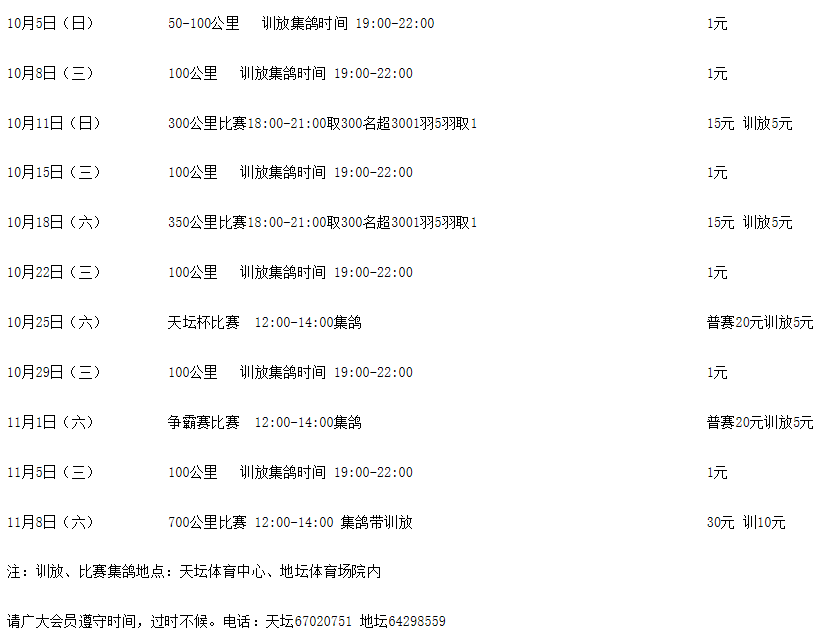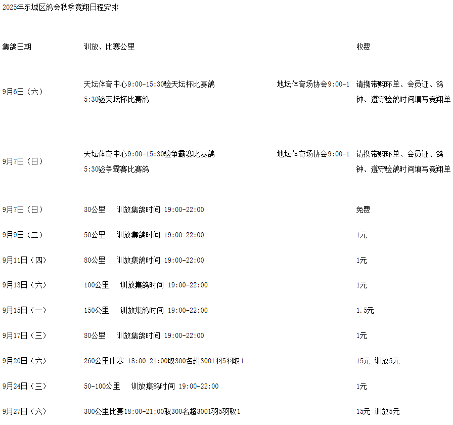 北京市东城区信鸽协会公布2025年秋季训放比赛计划,于9月6日开始训放,9月20日正式打响比赛,共四关,分别是260公里、300公里、300公里、350公里。11月将举行700公里比赛。