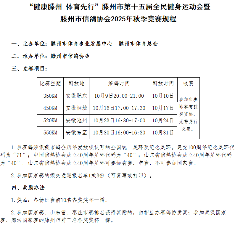 山东滕州市信鸽协会公布2025年秋季竞赛规程,10月10日正式打响比赛,共四关,分别是350公里、450公里、520公里、550公里。查看原文>>
