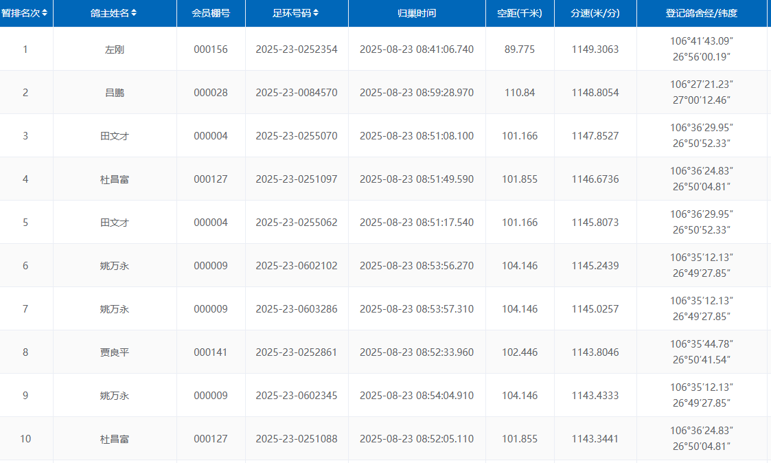 一个多小时后,首批归巢小队踏响归巢钟。来自左刚鸽友的2025-23-0252354赛鸽,于8点41分6秒报进,以1149.3063米/分的速度位列第一名。十几分钟后,吕鹏鸽友的2025-23-0084570报进,平均分速1148.8054米/分,位列第二名。