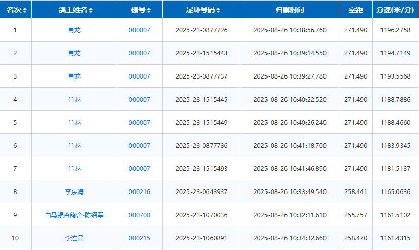 10点38分56秒,首羽小将归来,来自肖龙鸽友的2025-23-0877726赛鸽勇夺冠军,平均分速1196.2758米/分。之后,肖龙连连拿下亚军、季军、殿军、5名、6名、7名,实力惊人!