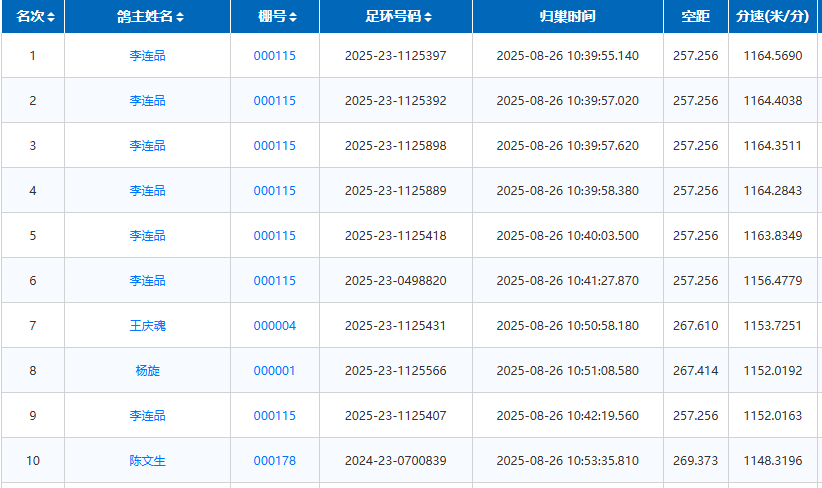 10点39分左右,第一梯队报进。前六名均被鸽友李连品包揽,冠军鸽以1164.5690米/分的速度率先归巢,足环号为2025-23-1125397。其名下另两羽2025-23-1125392、2025-23-1125898分别获得亚军、季军。除前六名外,李连品还有一羽获得第九名,共计7羽闯入十强。