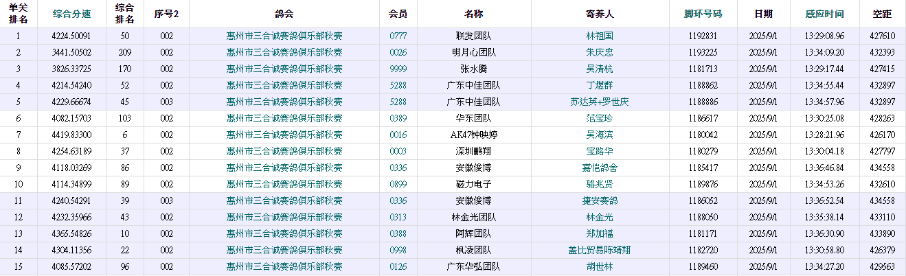 冠军:联发团队鸽友林祖国,赛鸽环号1192831,归巢时间为13时29分08秒,空距427公里,分速1020.1853米/分。
