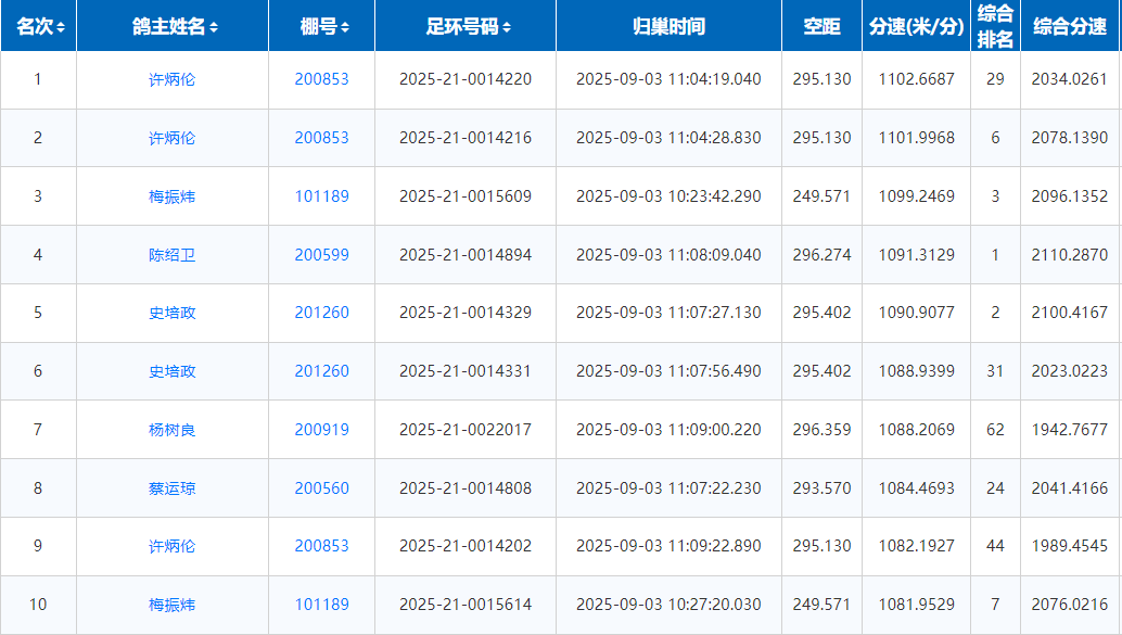 上午11时04分,鸽友许炳伦的两羽赛鸽先后报进。一羽2025-21-0014220,凭借空距295.13公里,分速1102.6687米/分的成绩,拿下本场冠军!另一羽2025-21-0014216,分速1101.9968米/分,斩获本场亚军。该鸽友另还有赛鸽获得第9、16、19、20等名次。恭喜许鸽友包揽冠亚,实力了得!