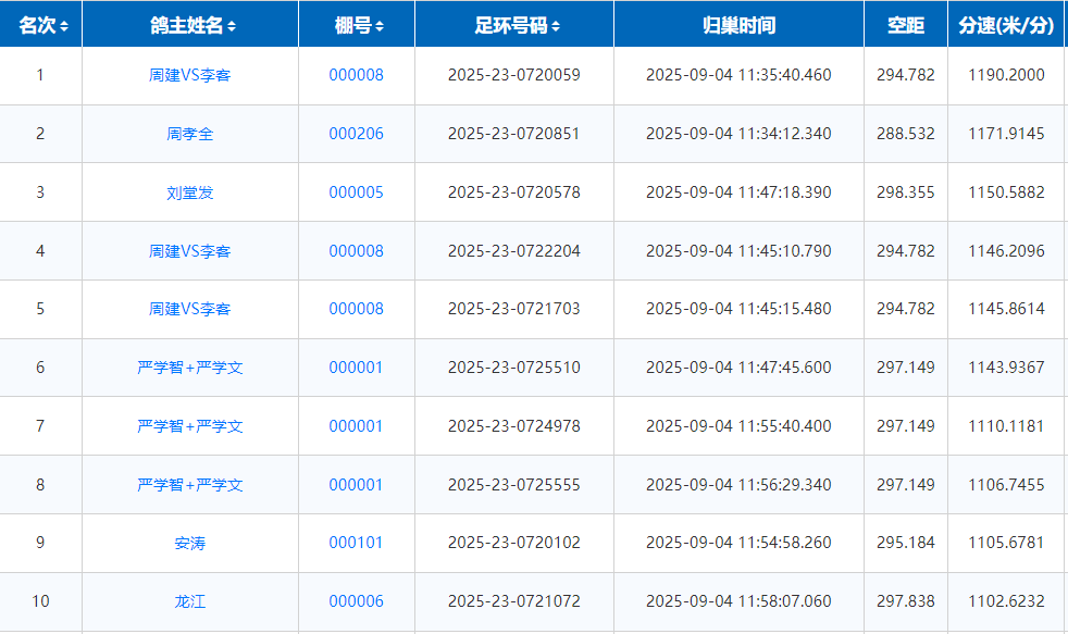 中午11时35分,鸽友周建VS李客的一羽2025-23-0720059打钟报进,凭借空距294.7公里,分速1190.2米/分的成绩,拿下预赛冠军!十分钟后,该团队另有两羽赛鸽顺利归巢,分别获得第四、第五的好成绩。